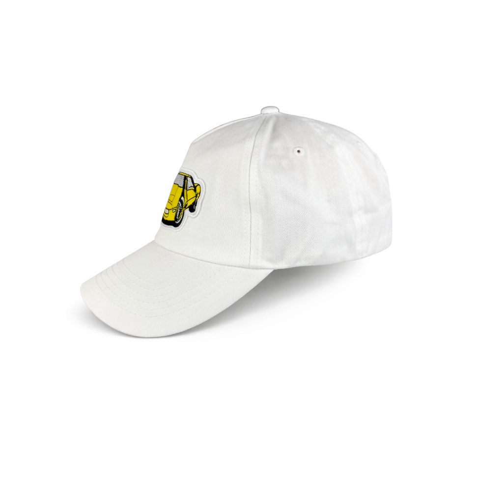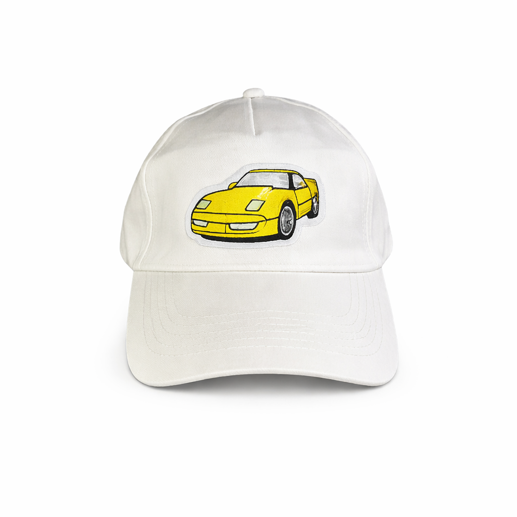 Biała czapka z daszkiem ozdobiona naszywką z żółtą Corvette C4. Styl retro, świetna jakość i wyrazisty akcent dla fanów motoryzacji.