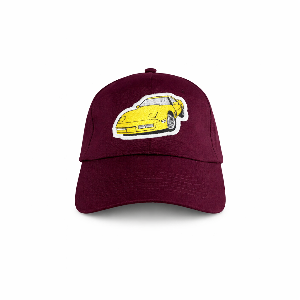 Czapka z daszkiem w głębokim bordowym kolorze to połączenie klasyki z motoryzacyjną pasją. Z przodu czapki znajduje się haftowana naszywka przedstawiająca kultową Corvette C4 – w intensywnym żółtym kolorze, który kontrastuje z tłem, przyciągając wzrok.