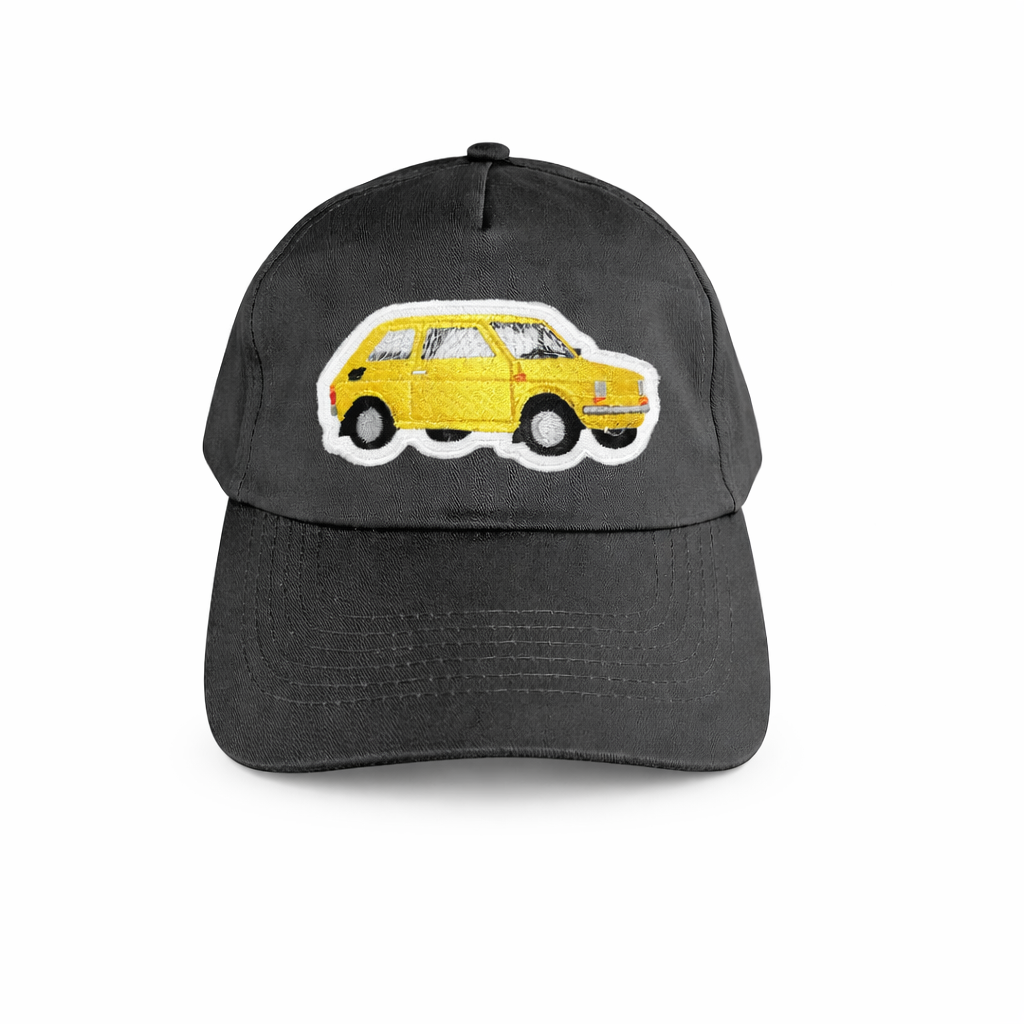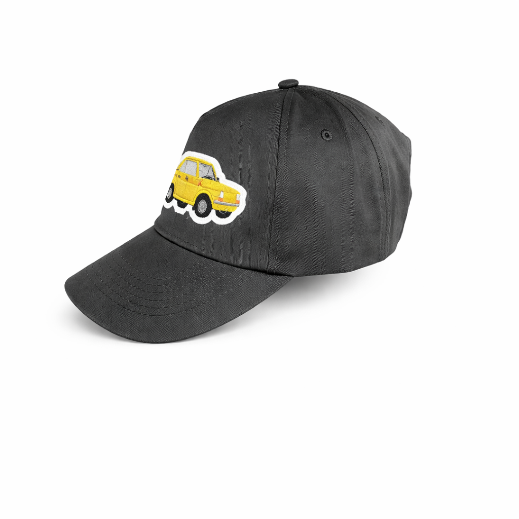 Czapka z daszkiem w odcieniu grafitowym została ozdobiona haftowaną naszywką przedstawiającą żółtego Fiata 126p — ikonę motoryzacji PRL. To doskonały wybór dla miłośników retro klimatu, samochodów z duszą i wyróżniających się dodatków.