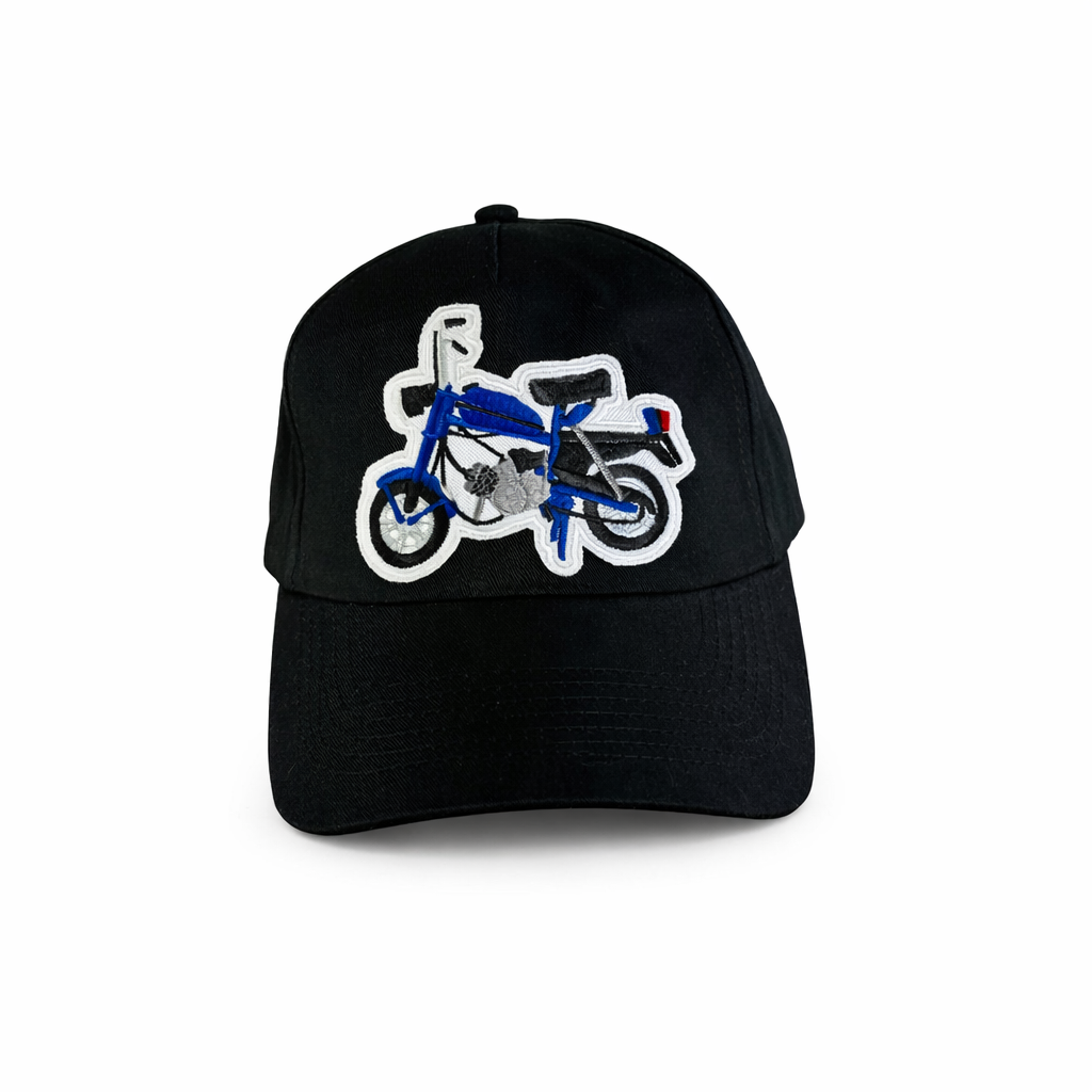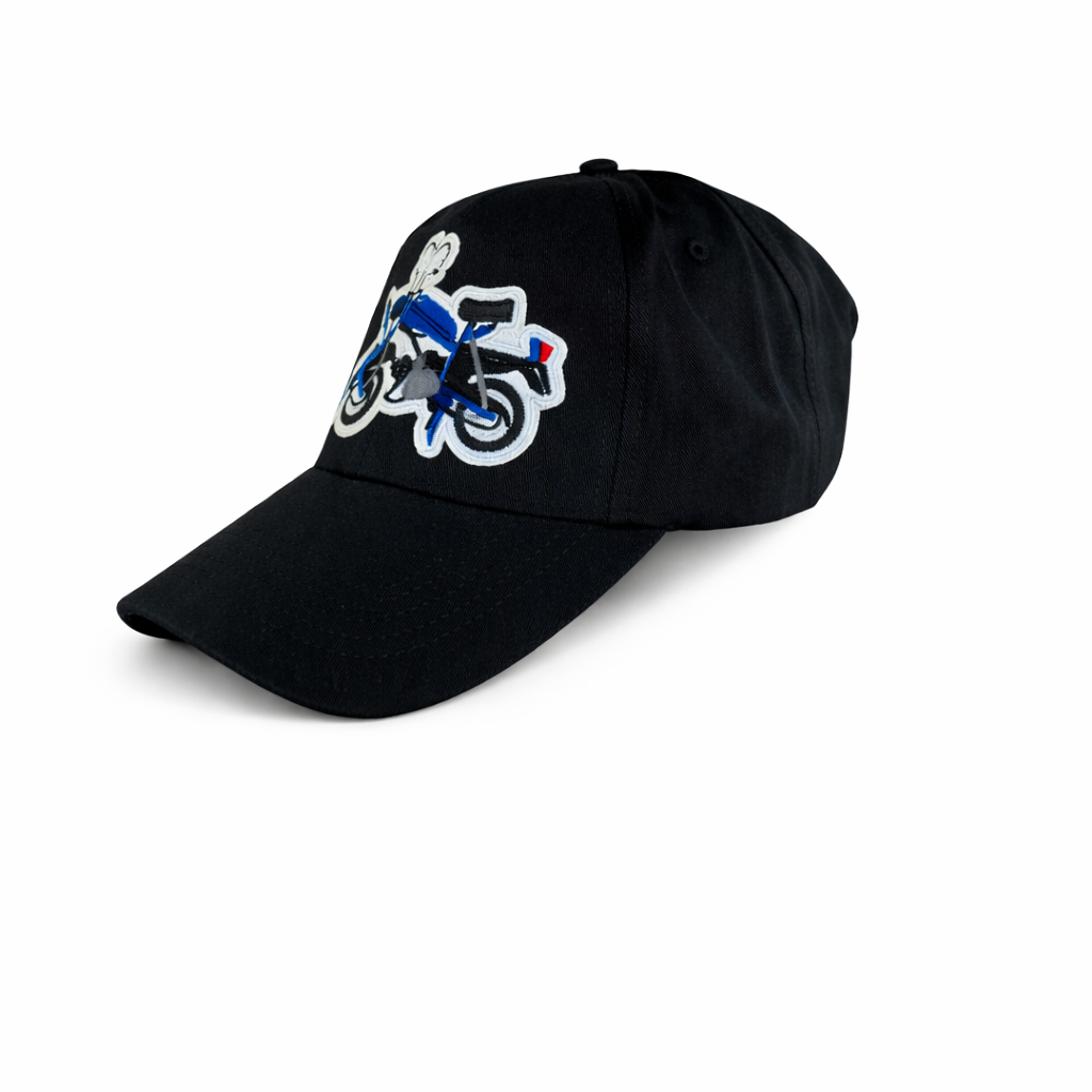 Czapka z daszkiem czarna z naszywką Motorynka Romet Pony – niebieska haftowana