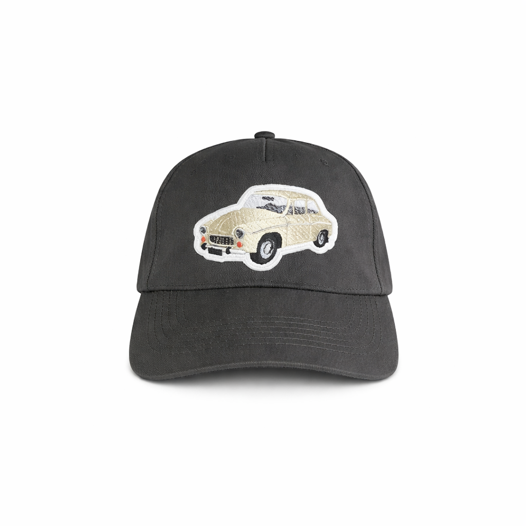 Grafitowa czapka z daszkiem ozdobiona haftowaną naszywką przedstawiającą kultową Syrenę. Idealna dla fanów polskiej motoryzacji!