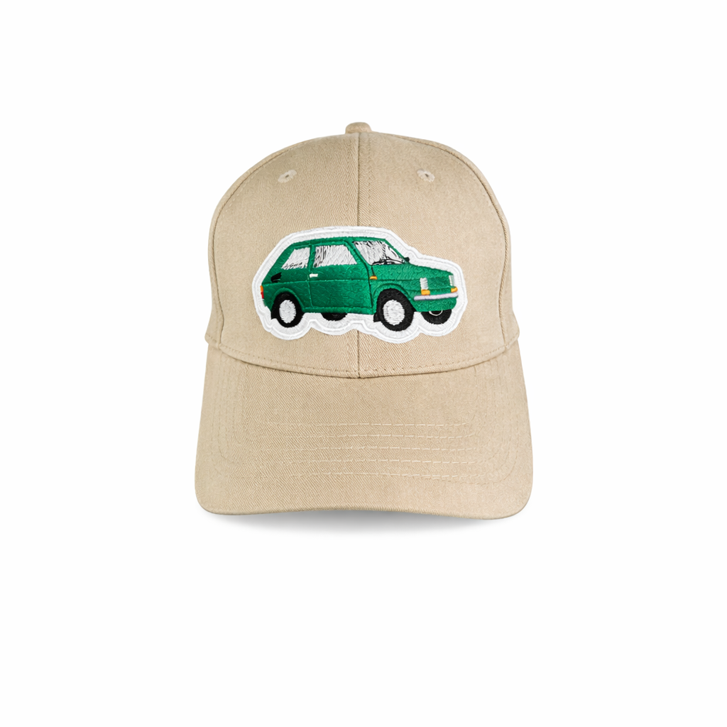 Beżowa czapka z daszkiem z haftowaną naszywką zielonego Fiata 126p. Lekka, wygodna, idealna dla młodszych miłośników klasyków!