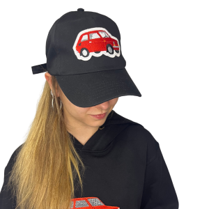 Stylowa czarna czapka z daszkiem, ozdobiona naszywką z czerwonym Fiatem 126p. Idealna dla miłośników klasyki motoryzacyjnej i oldschoolowego looku.