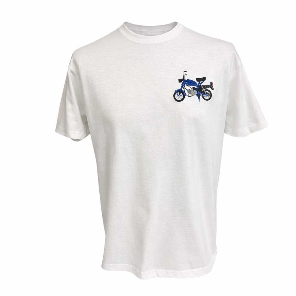 Biała koszulka z haftem niebieskiej motorynki przyciąga uwagę eleganckim i czystym wyglądem. Haft komputerowy perfekcyjnie odwzorowuje legendarny jednoślad, będący symbolem wolności i przygody. Wysoka jakość materiału oraz dbałość o detale sprawiają, że koszulka świetnie nadaje się do codziennego noszenia lub na spotkania tematyczne.