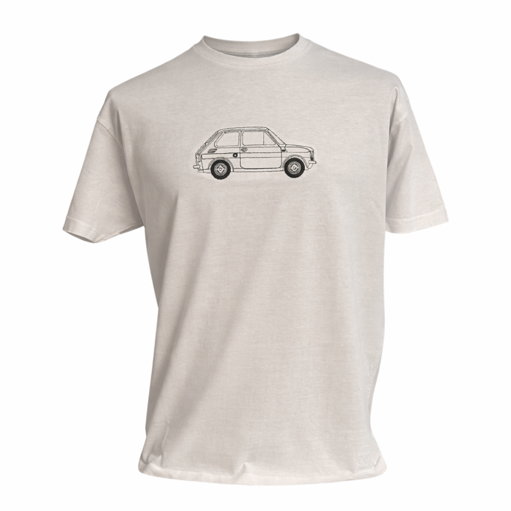 Biała koszulka z krótkim rękawem, ozdobiona haftem komputerowym – szkicem kultowego Fiata 126p. Idealna dla miłośników klasyki motoryzacji.