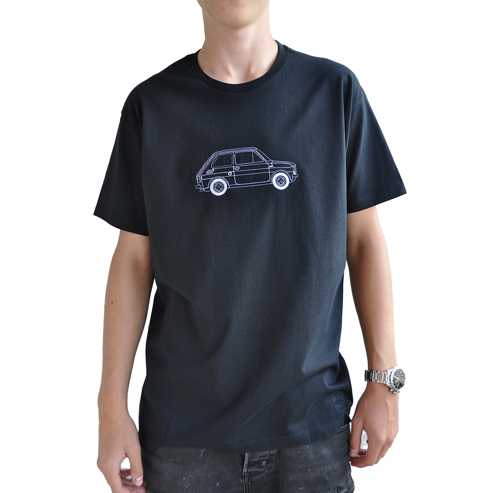 Czarna koszulka z krótkim rękawem, ozdobiona komputerowym haftem przedstawiającym szkic legendarnego Fiata 126p. Styl retro z charakterem.