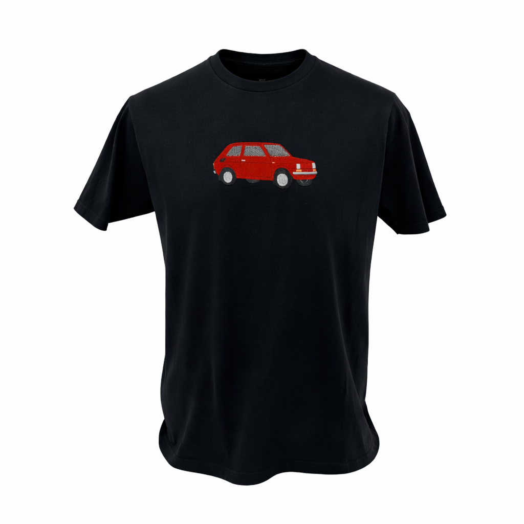 Czarna koszulka z krótkim rękawem z komputerowym haftem czerwonego Fiata 126p. Klasyka PRL w nowoczesnym wydaniu – dla fanów motoryzacji retro.