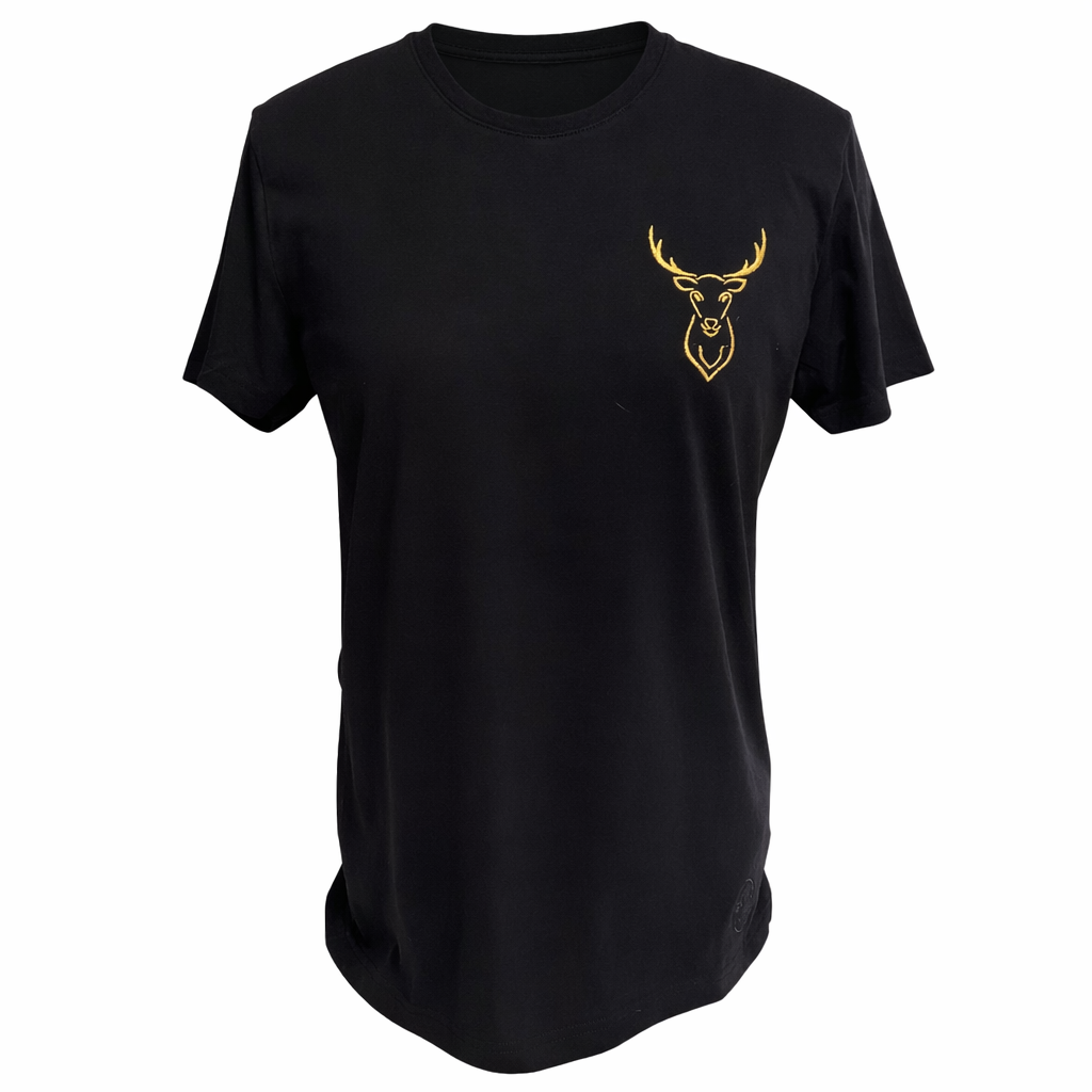 Delikatny złoty haft głowy jelenia nadaje koszulce wyjątkowego charakteru, łącząc nowoczesność z klasyką.