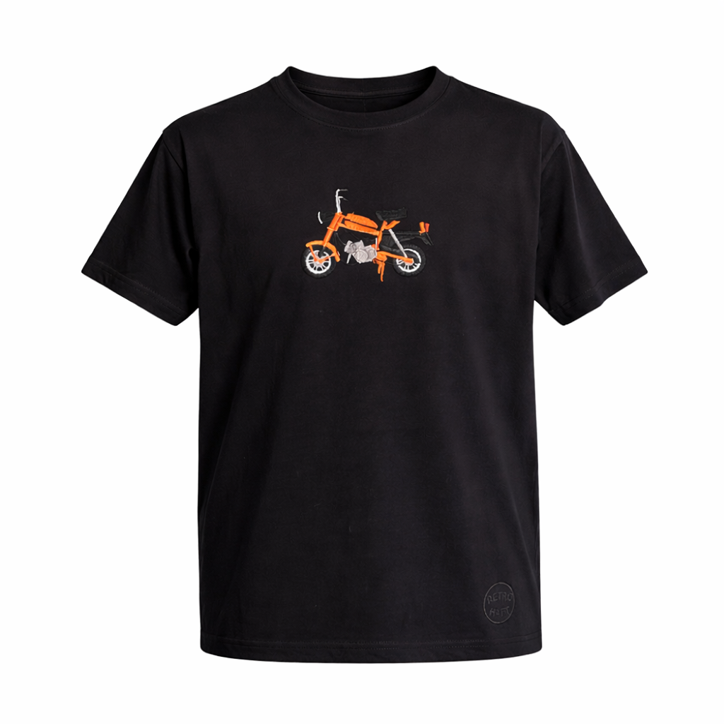 Haftowana pomarańczowa motorynka to ukłon w stronę klasyków PRL. Komputerowy haft wykonany maszynowo w pracowni Retrohaft, z dbałością o każdy detal. Centralne umiejscowienie wzoru nadaje koszulce wyjątkowego charakteru.
