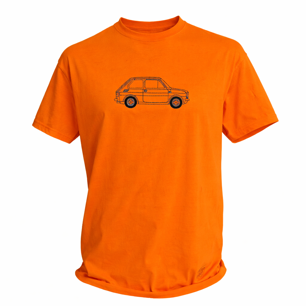 Koszulka z haftem szkicu Fiat 126p – pomarańczowa pasja retro