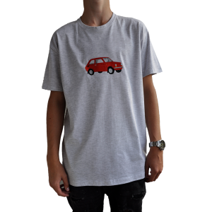 Szara koszulka z krótkim rękawem i haftem czerwonego Fiata 126p. Wygoda, jakość i kultowy motyw w stylu retro.