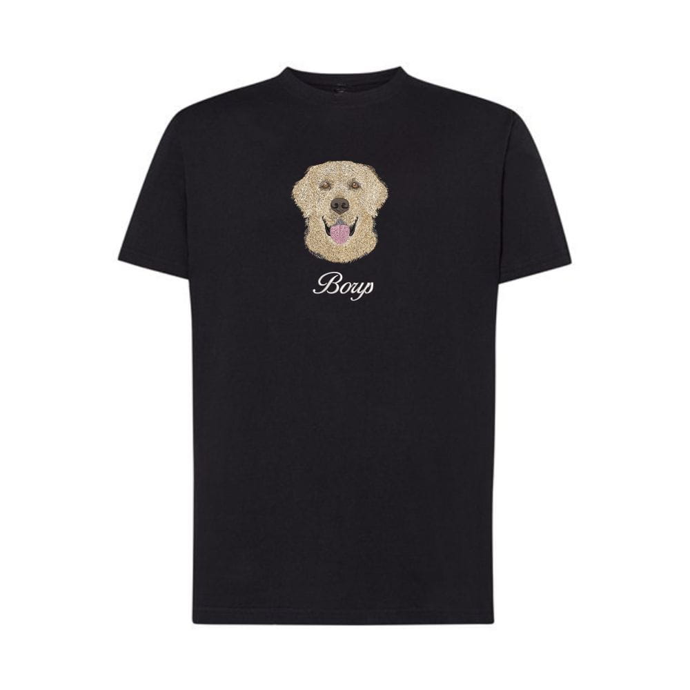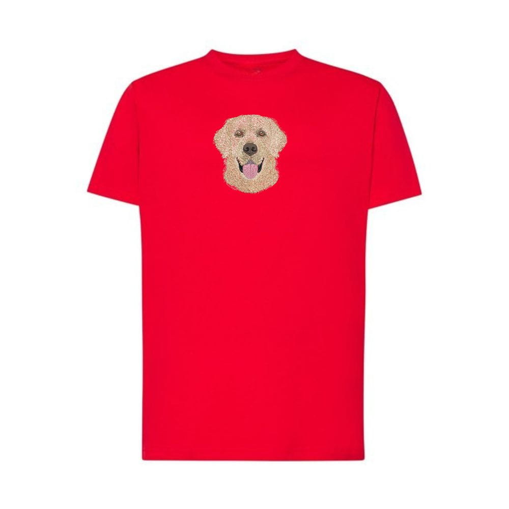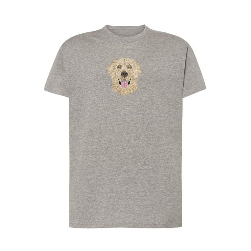 Koszulka unisex z haftem komputerowym przedstawiającym głowę Labradora Retrievera. Haft o wymiarach ok. 15 cm wysokości i 15 cm szerokości, umieszczony na środku przodu. Wzór ręcznie opracowany w pracowni AgaSzyje Haft Komputerowy (RetroHaft).