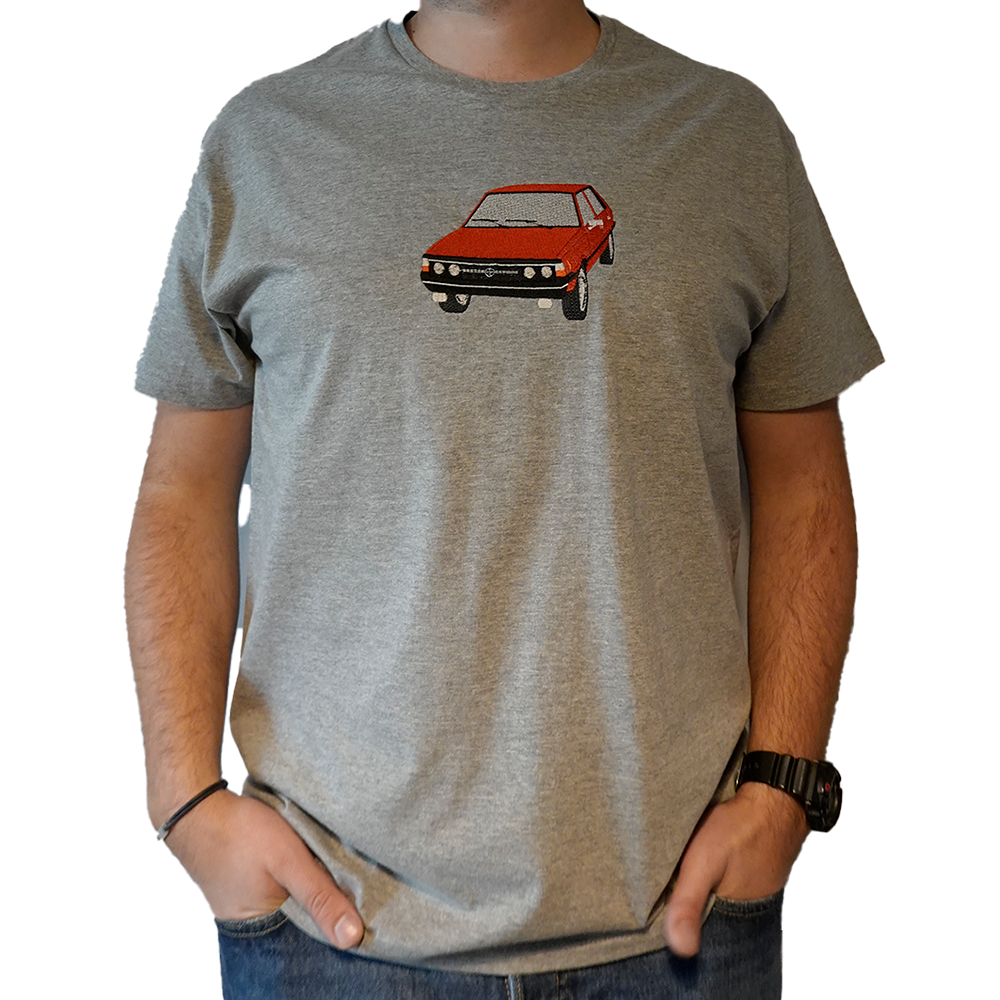 Stylowa szara koszulka z czerwonym haftem kultowego FSO Poloneza. Idealna dla miłośników klasycznej motoryzacji i stylu retro.