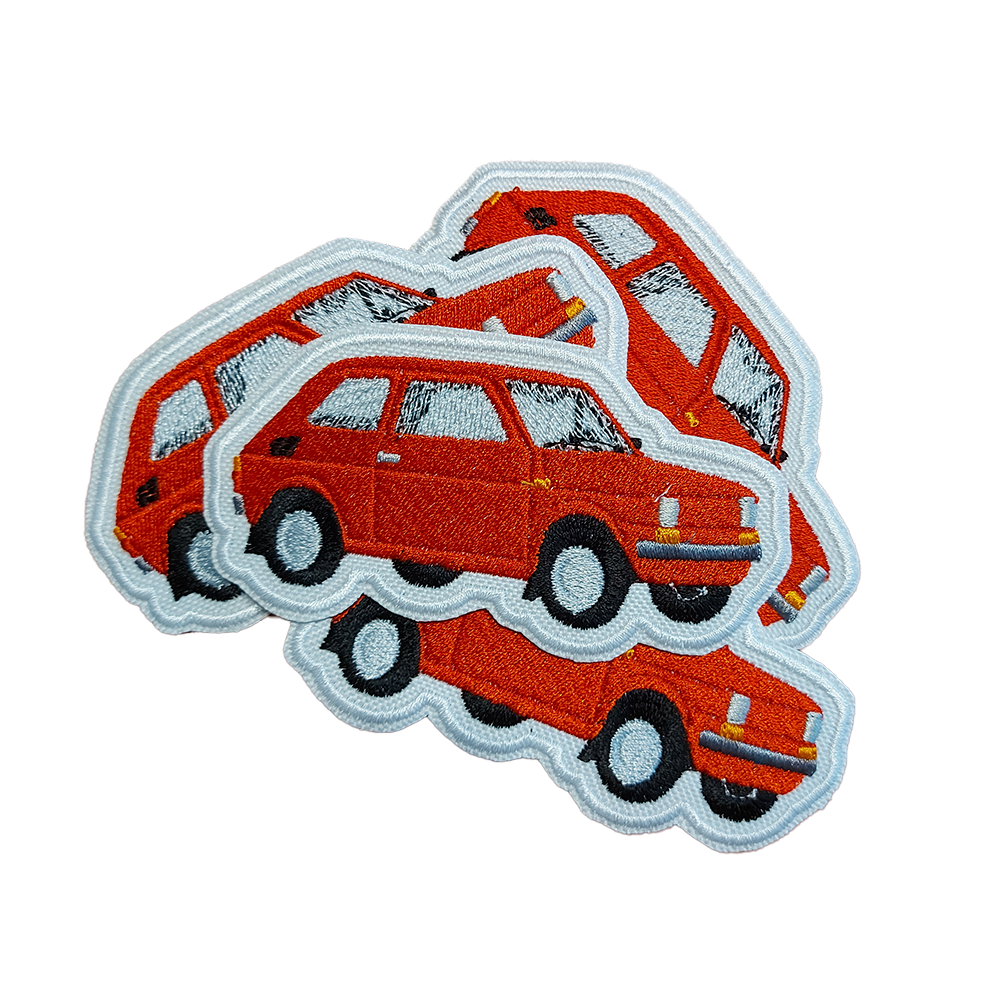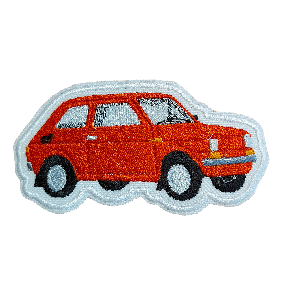 Czerwona naszywka z kultowym Fiatem 126p – precyzyjny haft, retro klimat i łatwe mocowanie żelazkiem. Idealna do personalizacji ubrań i akcesoriów!