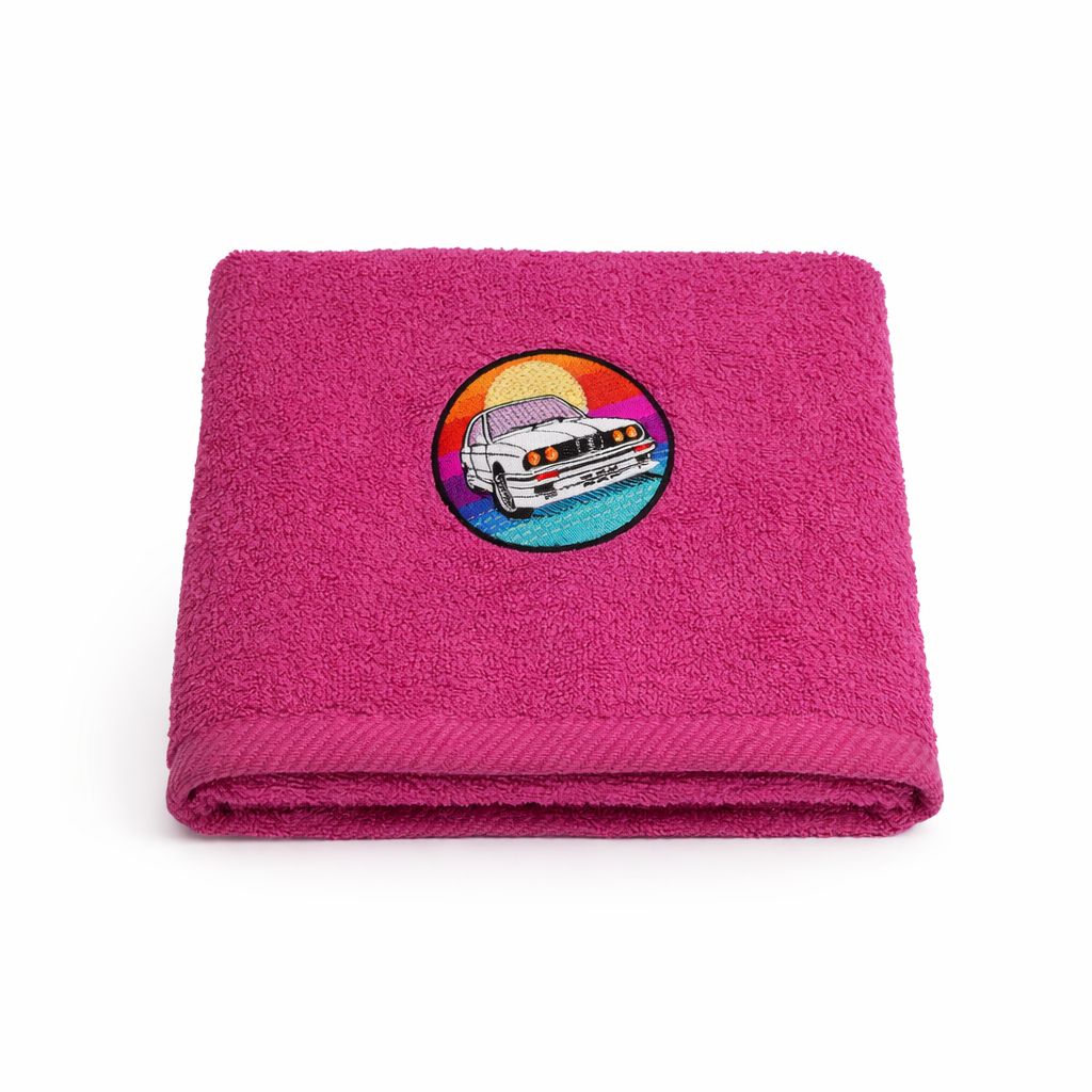 Różowy ręcznik z haftem BMW E30 M3 w klimacie lat 80. – idealny prezent dla fanów klasycznej motoryzacji i stylowego designu.