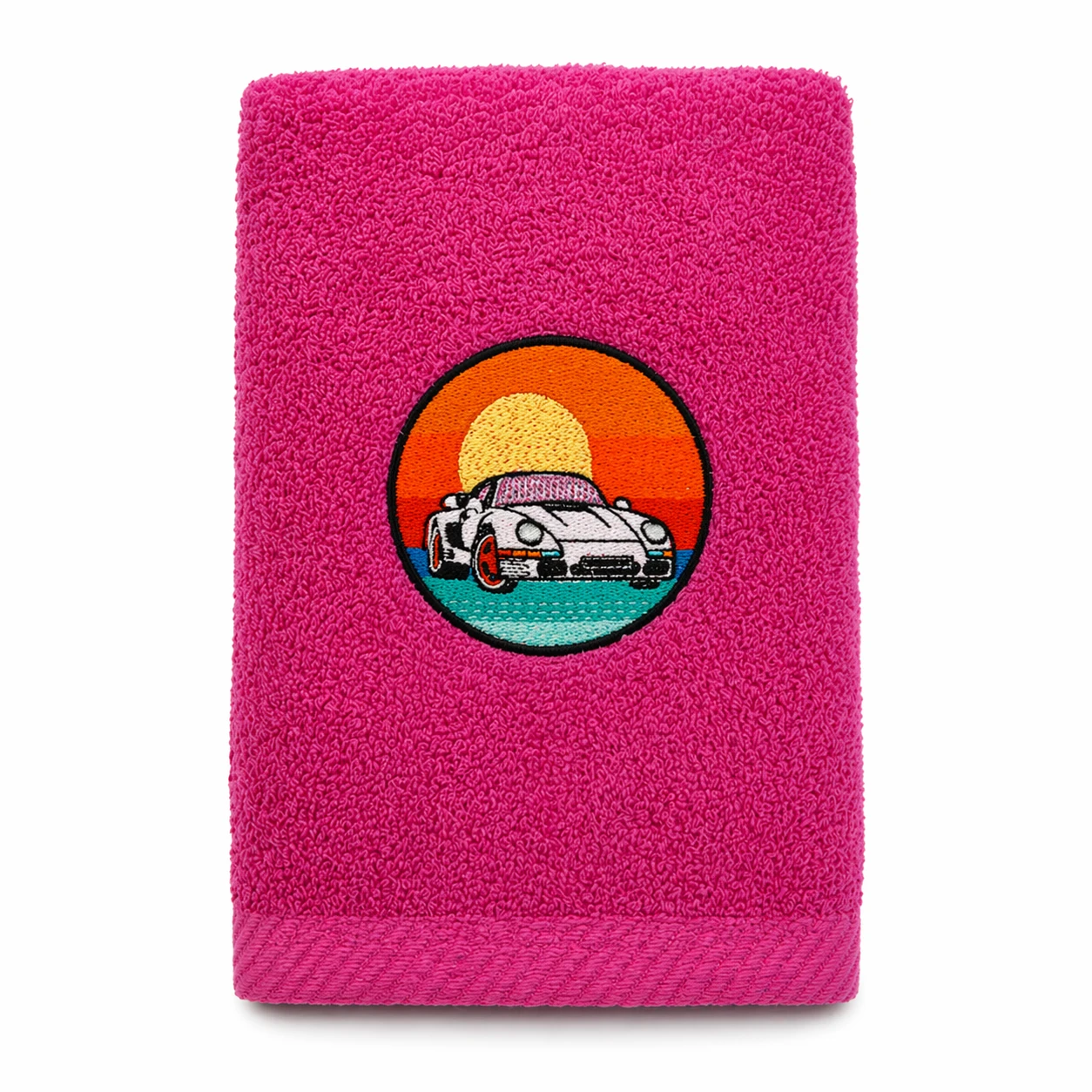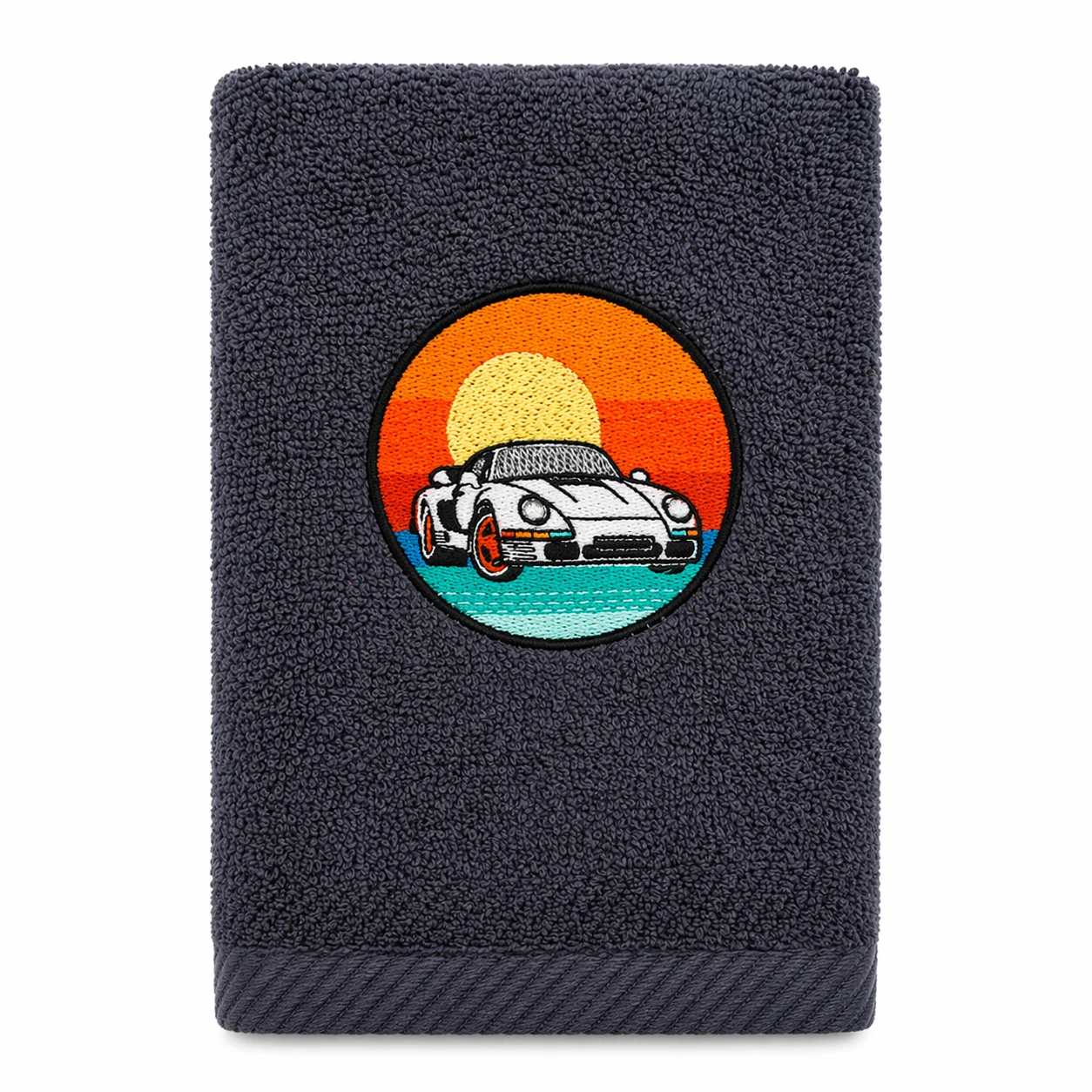 Na froncie znajduje się starannie wykonany haft komputerowy z kultowym Porsche 959, dostępny w dwóch wariantach kolorystycznych ręcznika: