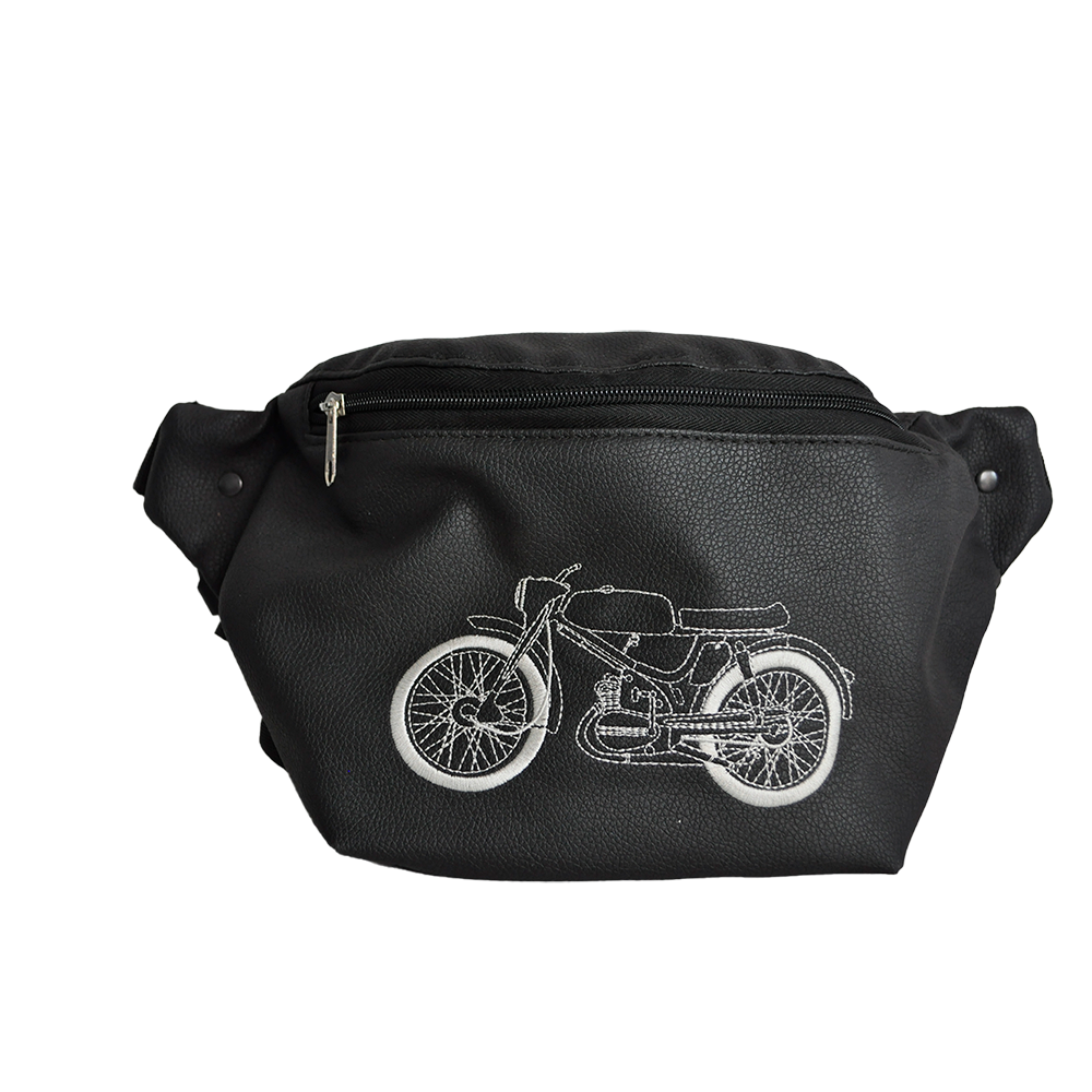 Czarna torebko-nerka z haftem motoroweru Komar Sport. Minimalistyczna, wygodna i wyjątkowa – idealna dla fanów retro klasyki.