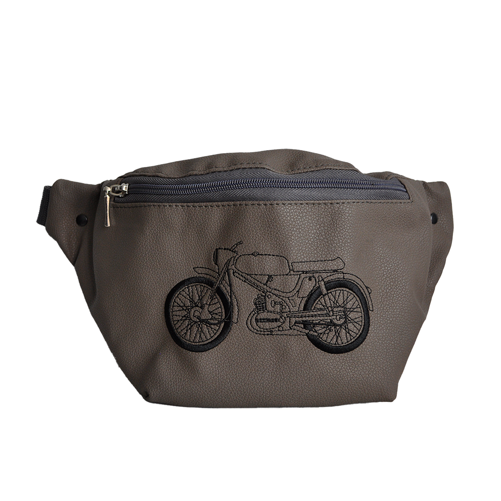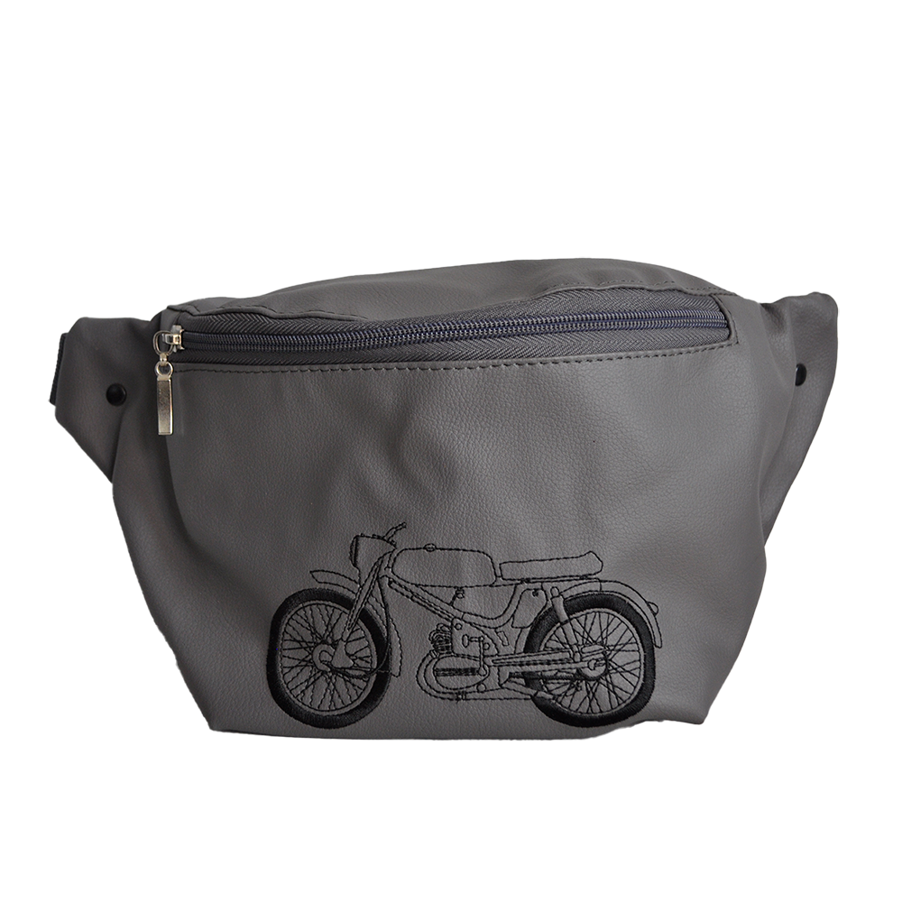 Na froncie torebki znajduje się komputerowy haft szkicu motoroweru Komar Sport w czarnej tonacji, subtelnie wyróżniający się na tle materiału.